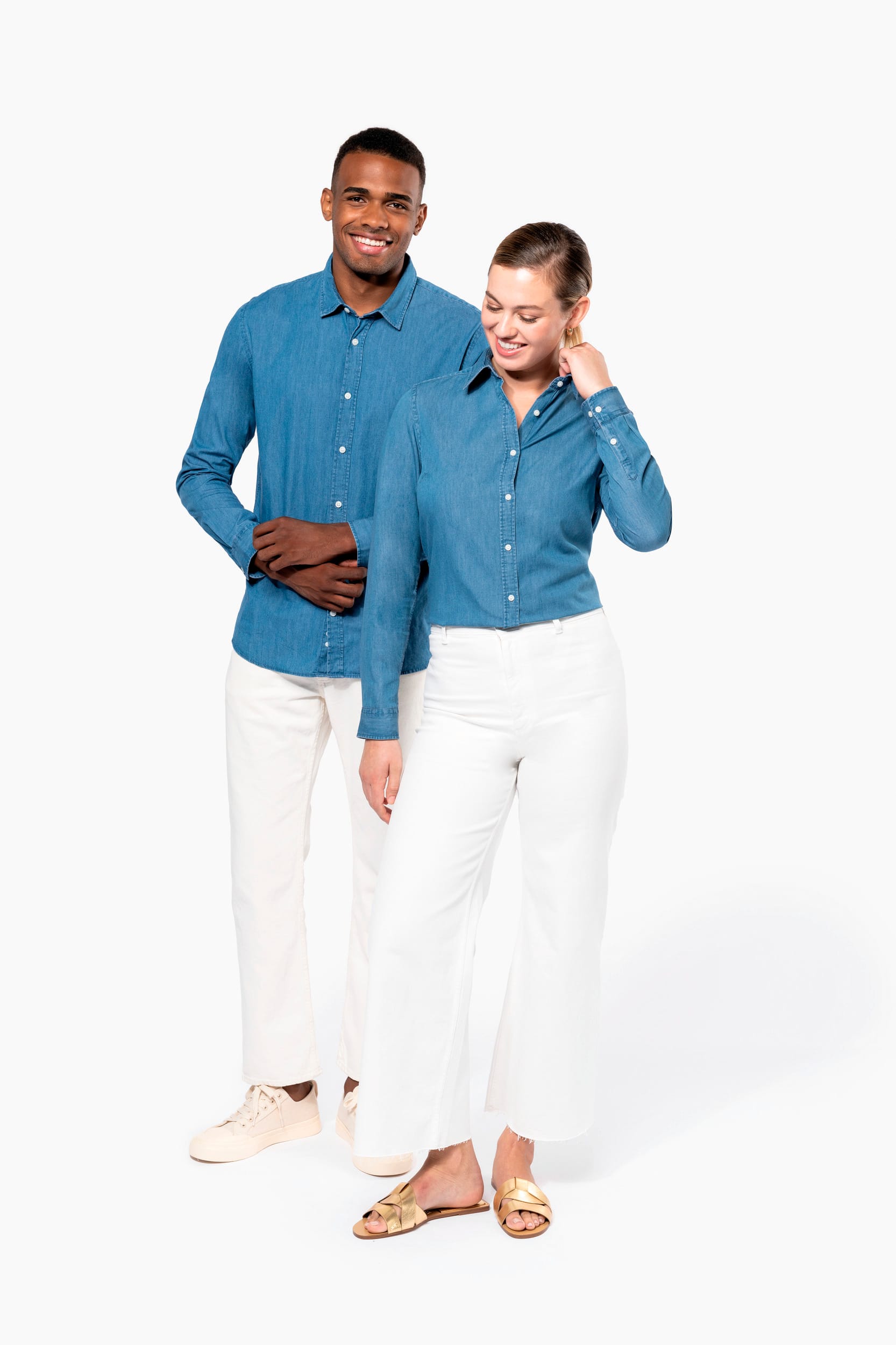 100% coton. Toile légère effet denim. Matière souple et confortable. Coupe droite. Col avec bande fantaisie intérieure. Boutons contrastés. Poignets réglables. Ce produit a subi un traitement spécial et présente un aspect volontairement vieilli. Ce procédé de fabrication implique des variations de couleurs d’un produit à l’autre et rend chaque pièce unique.