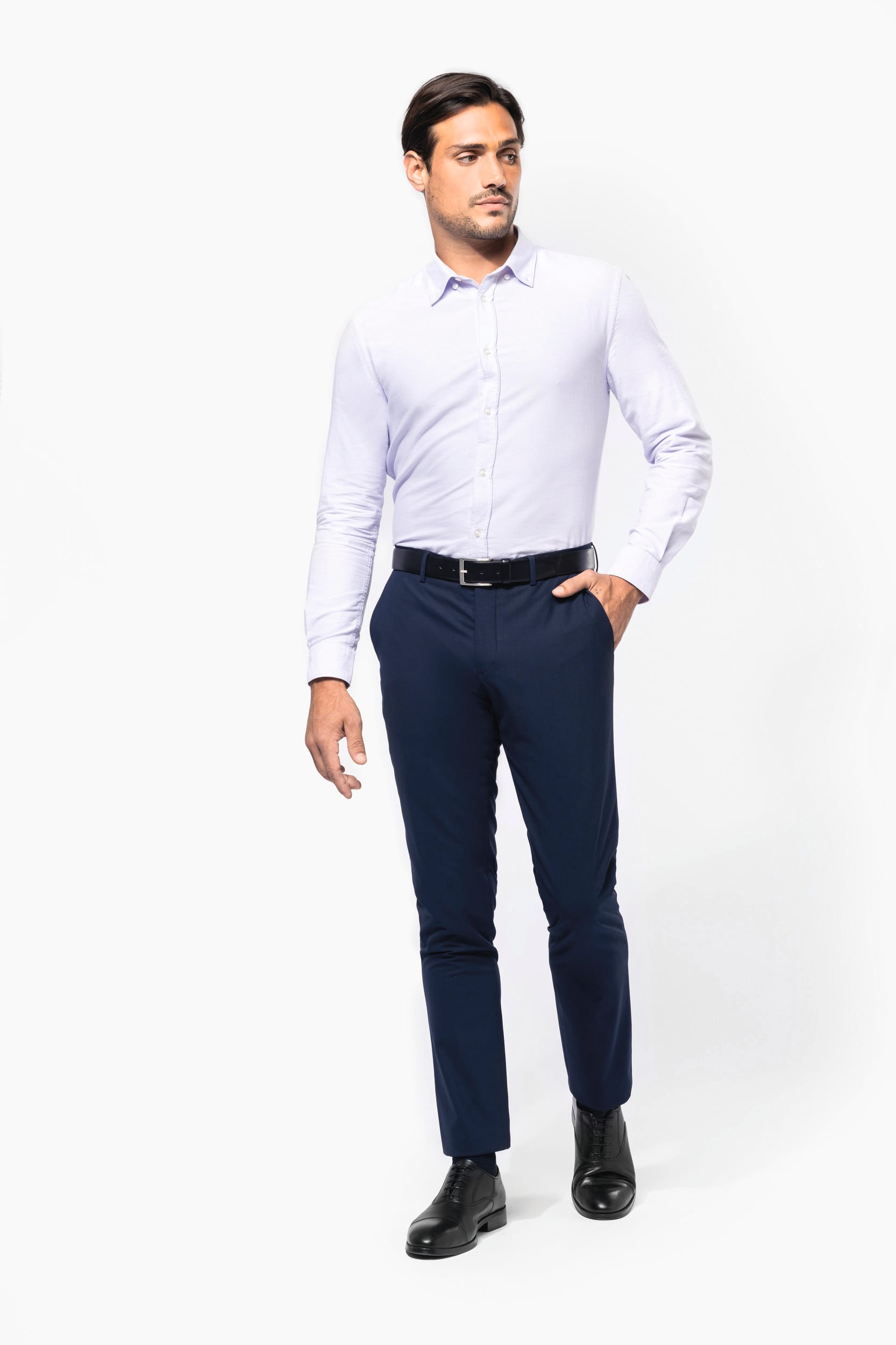 100% coton. Coton peigné. Tissu en Oxford. Coupe droite. Col chemise pointe de col boutonné. Bouton blanc effet nacré sur toutes les couleurs. Patte de boutonnage rapportée milieu devant. Empiècement dos doublé avec plis d’aisance. Manches longues avec poignets ajustables à angles arrondis avec patte de manche capucin boutonnée. Pas d’étiquette de marque uniquement une puce de taille Tear Away pour faciliter la personnalisation. Fabriqué au Portugal.