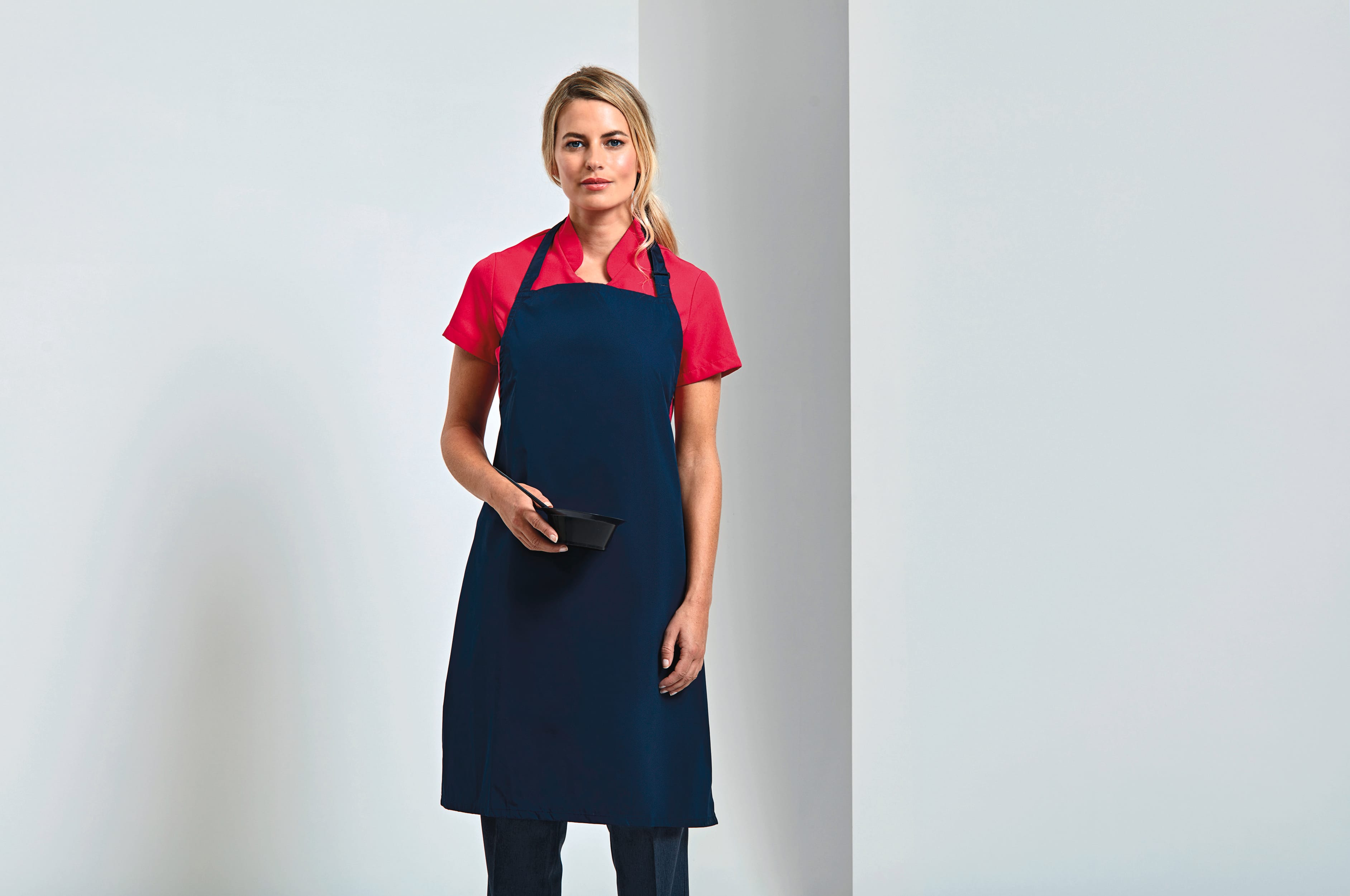 100% polyuréthane recouvert de polyester. Tablier imperméable avec lanière du cou ajustable. Longueur des cordons : 90 cm. Dimensions : H 86 cm x L 72 cm.